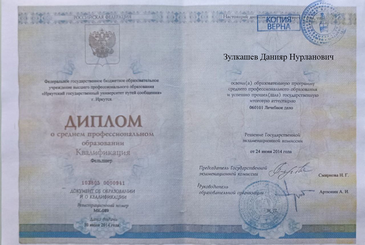 Меня зовут Зулкашев Данияр Нурланович, я — фельдшер выездной наркологической бригады в наркологической клинике "Плюс" в Большеустьикинском. Я стремлюсь помогать людям, оказывая квалифицированную медицинскую помощь в самых разных ситуациях, и верю, что каждый пациент заслуживает внимания и поддержки на пути к выздоровлению.